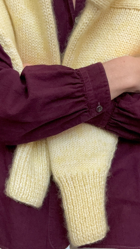 Each Jane Sweater is hand-knit in small batches from a luxurious blend of merino wool and mohair for incredible softness and warmth. The marled nature of the yarns adds texture, depth and uniqueness to every piece.
