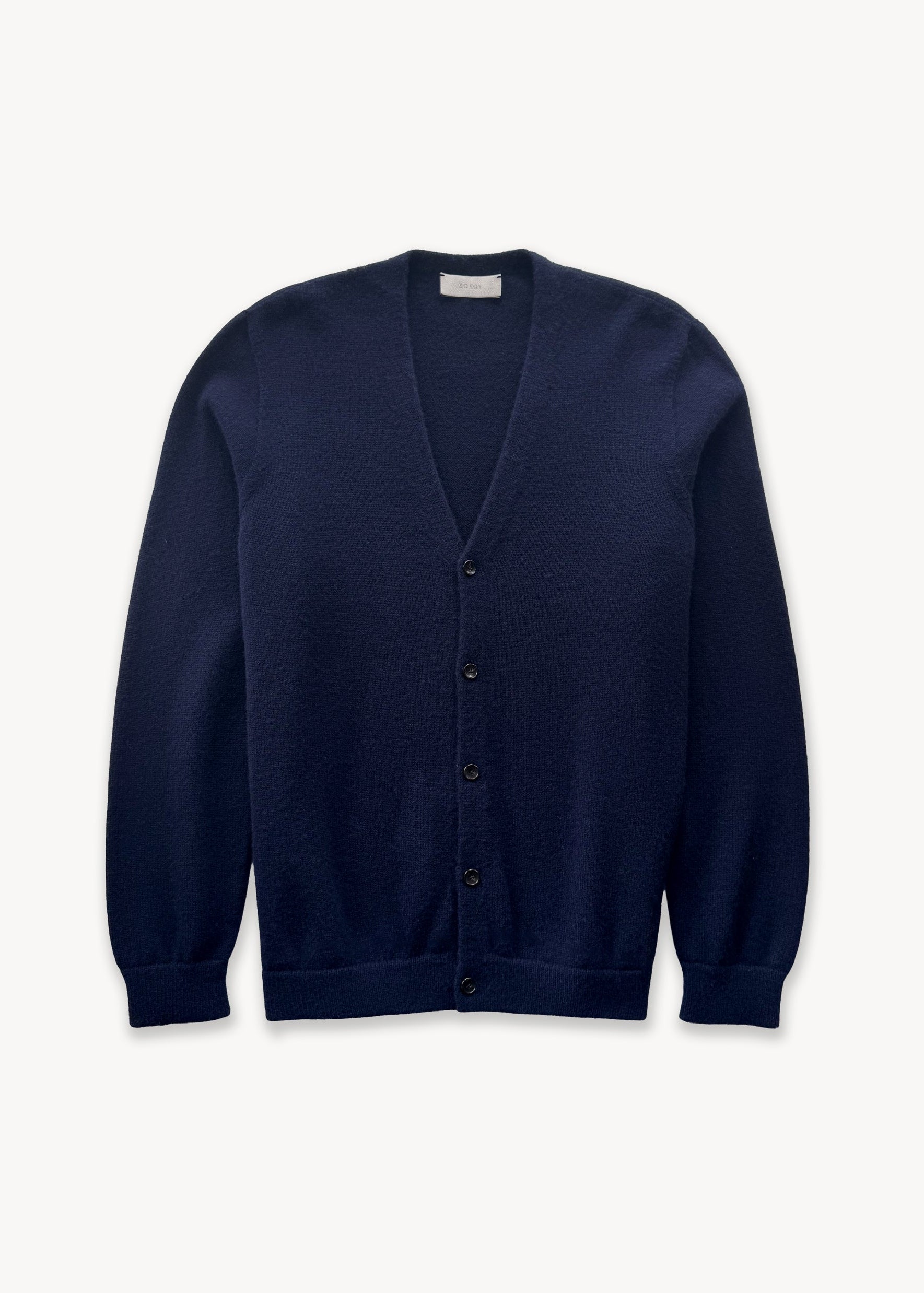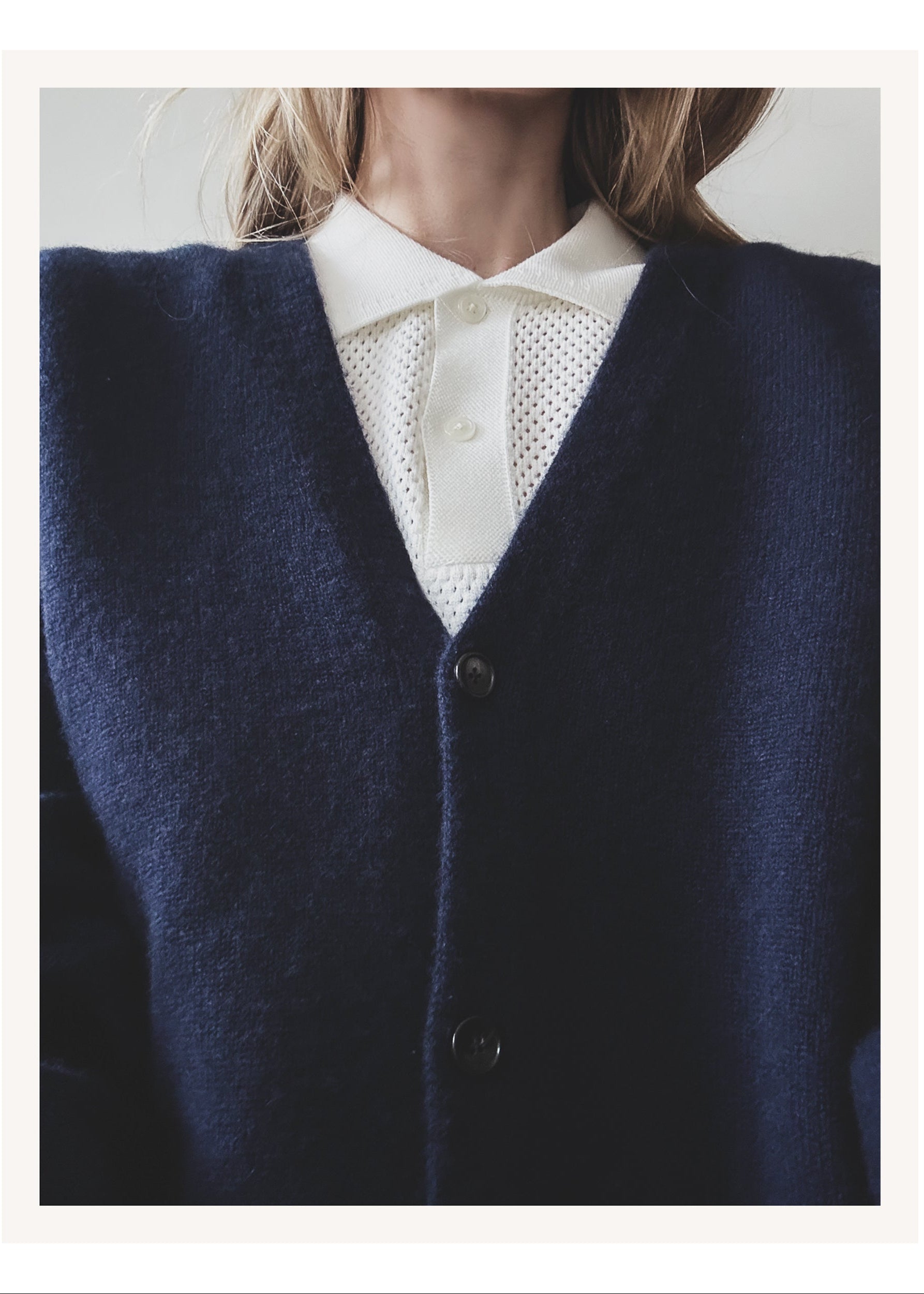 The Charlie is a timeless V-neck cardigan knit from exceptional Scottish-spun cashmere in a deep blue hue. Sourced from one of the world’s most respected heritage mills, the yarn is prized for its long-staple fibers, remarkable softness, and lasting resilience.